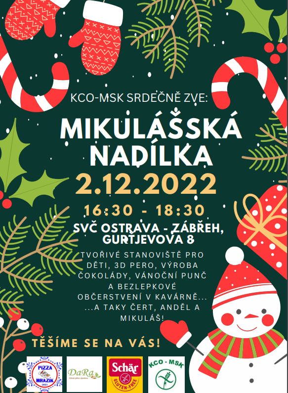 blíží se Vánoce a také náš Mikuláš. Srdečně vás zveme v pátek 2. 12. 2022 na skvělou bezlepkovou Mikulášskou nadílku. Za dětmi přijde Mikuláš s čertem a andělem a přinese jim dárky od firky Schaer (děti-členové dostanou balíček zdarma, sourozenci mohou dostat balíček za dobrovolný příspěvek). Dále je pro ně připraven bohatý mikulášský program. Dospělí mohou přijít posedět u kávy, punče a zákusku v kavárničce, kterou bude provozovat opět spřátelená kavárna DaRa.Firma Mrazík přiveze na ochutnávku pizzu.