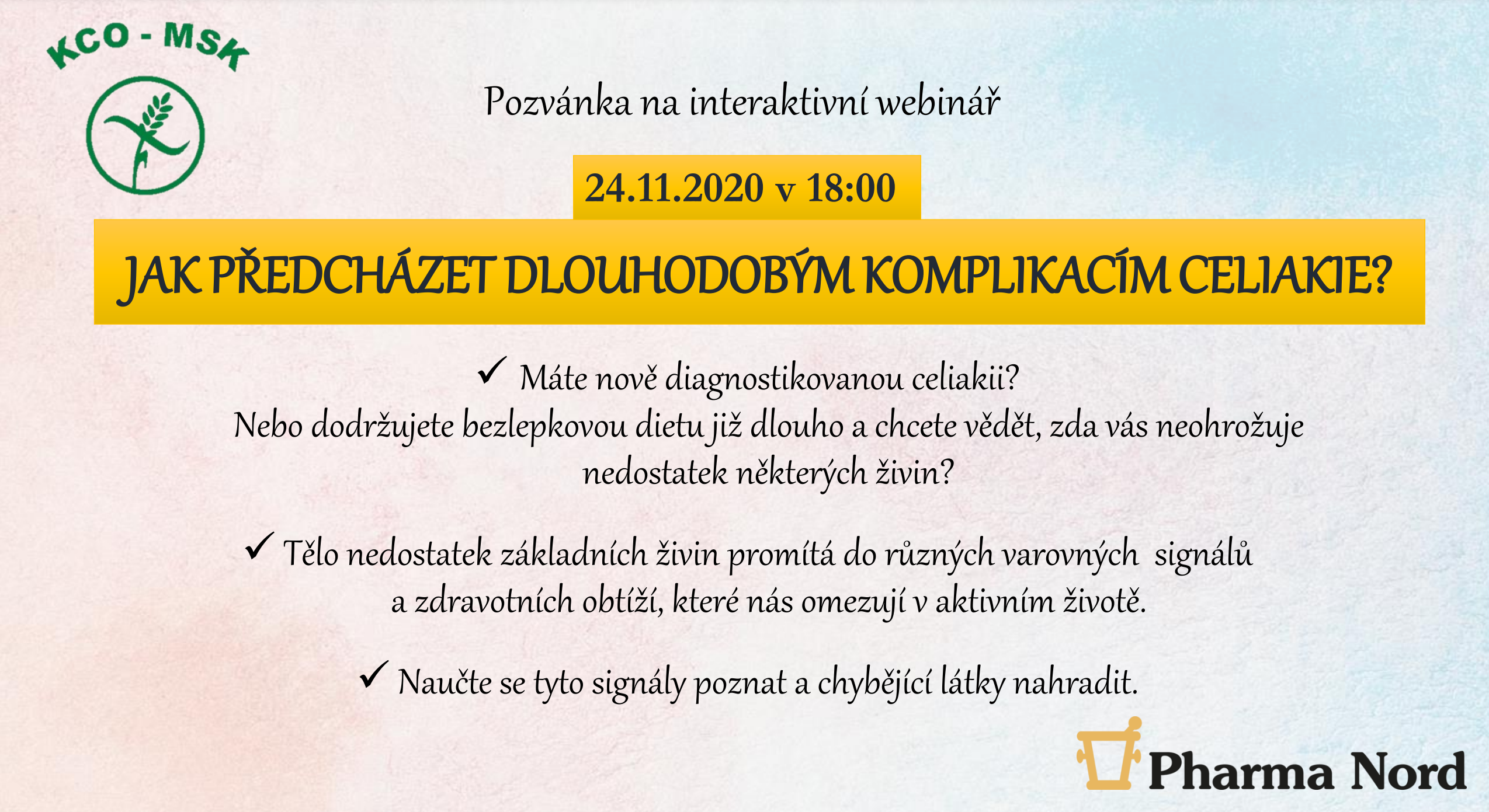 Ve spolupráci s nutriční specialistkou Mgr. Sládkovou Kavínovou z firmy Pharma Nord jsme pro naše členy klubu a cílovou skupinu celiaků připravili přednášku formou webináře. Zájemci se mohou přihlásit zde. Přednáška je zdarma.